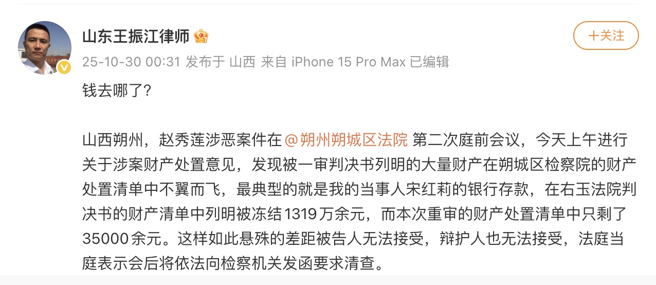 10月30日,山东王振江律师发帖说,“钱去哪了?山西朔州,赵秀莲涉恶案件在朔州朔城区法院第二次庭前会议,今天上午进行关于涉案财产处置意见,发现被一审判决书列明的大量财产在朔城区检察院的财产处置清单中不翼而飞,最典型的就是我的当事人宋红莉的银行存款,在右玉法院判决书的财产清单中列明被冻结1319万余元,而本次重审的财产处置清单中只剩了35000余元”。