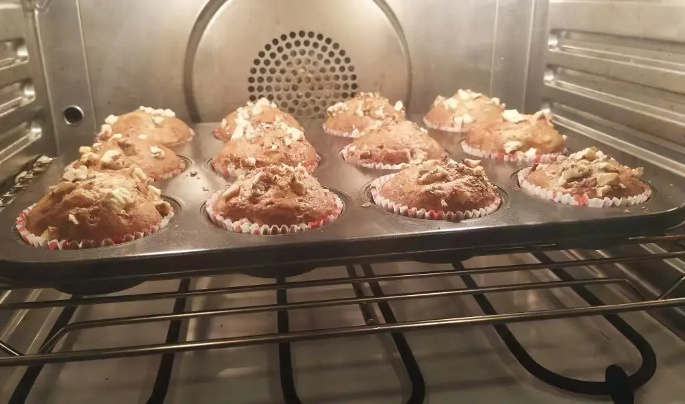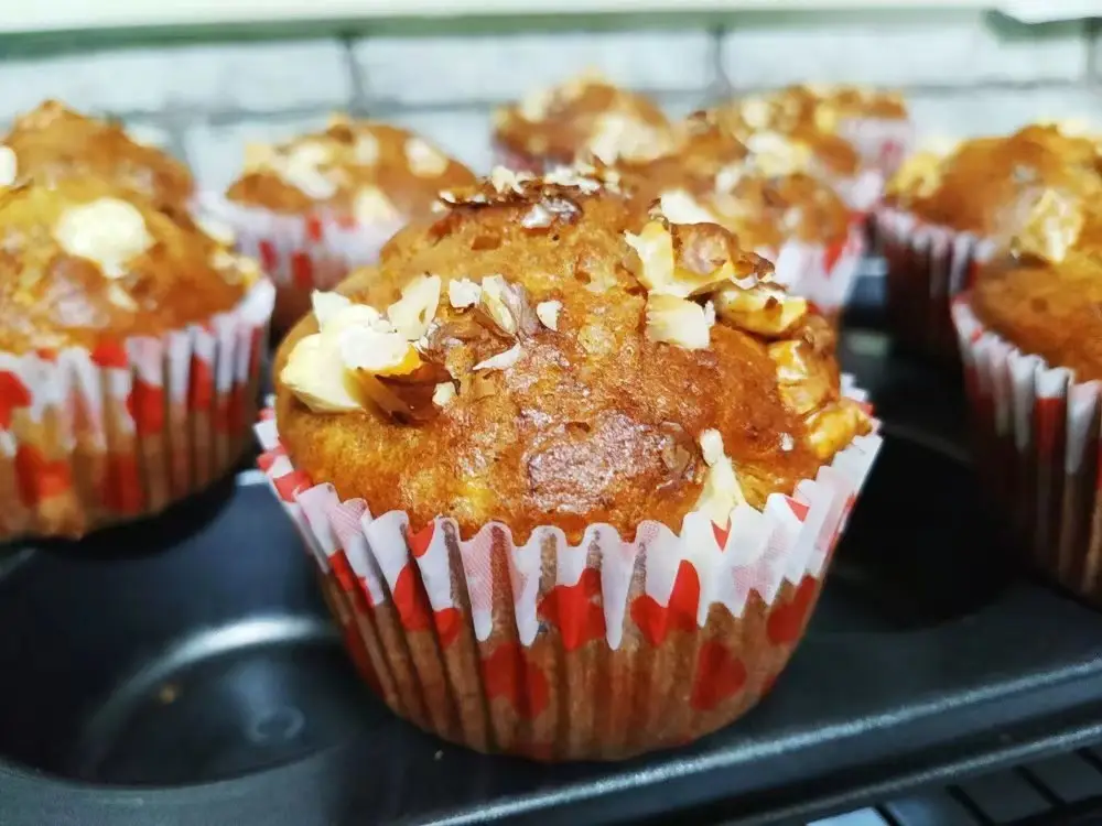 4、接着把纸杯摆好,混合物分别倒进去,七八分满的程度,再继续撒上核桃仁。送入烤箱,180度的温度,二十分钟就烤好了,可以延长两三分钟,色泽焦黄更美味。