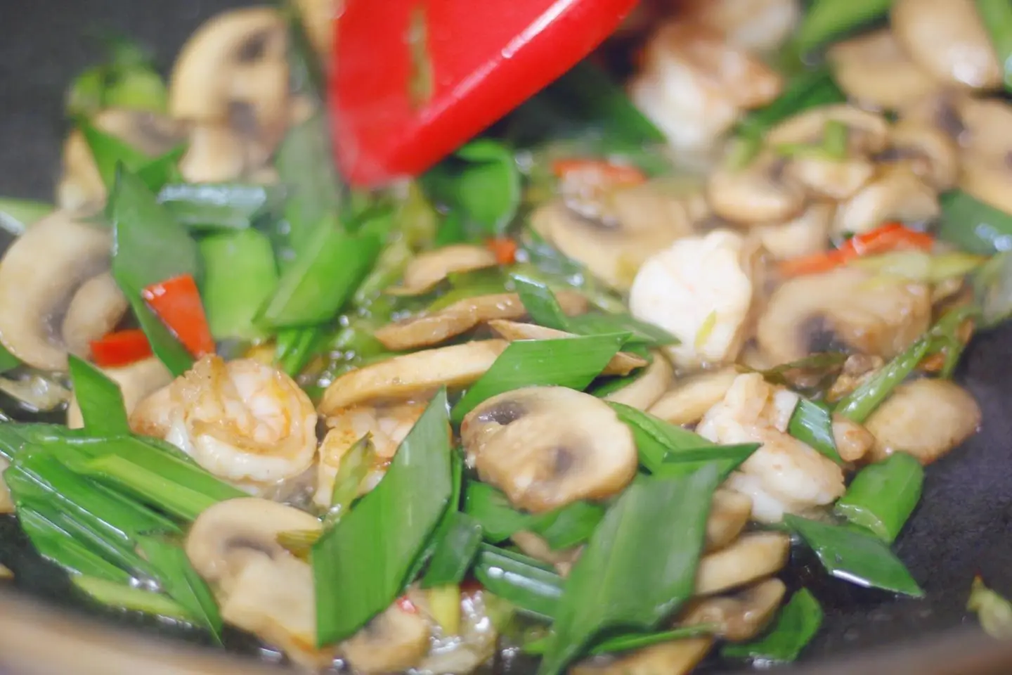 4、底油继续炒蘑菇,要多翻动,其鲜美的汤汁会被炒出来,一直炒到看起来不再是白色,就代表炒透了。往里边加点生抽,盐,放点蒜叶进去。