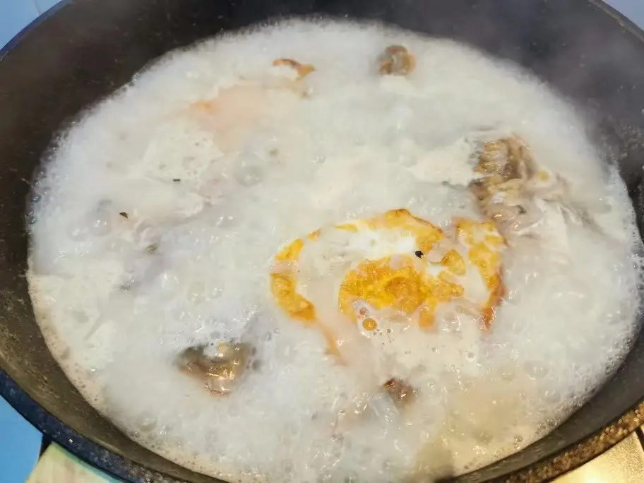 5、大火咕嘟二十分钟,鸡蛋再次放进去,加点白胡椒,盐,葱花,搅拌匀了,就可以关火了。