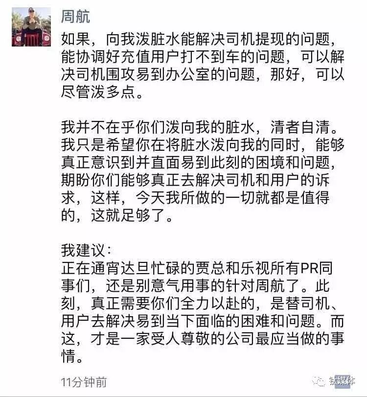 今天凌晨,周航在朋友圈再次声明回应称,清者自清,希望乐视在向他泼脏水的同时,先去解决好司机和用户的诉求。