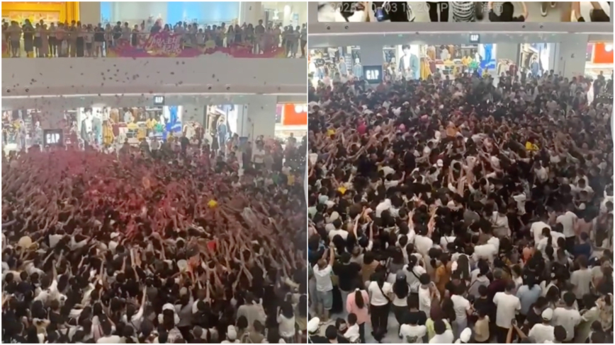 网传视频显示,一商场的一楼,挤满了人,红色的纸片从上空洒下来,人群挤向红纸片飘落处,玻璃护栏被挤得变形,突然,一片人潮倒地。