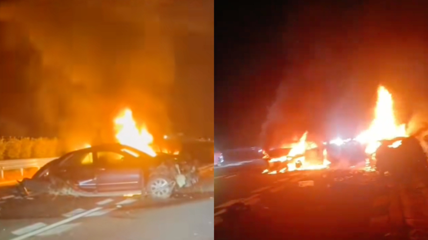 2025年10月4日,广西玉林一高速公路多车连环相撞,其中两辆车起火烧毁,车上有一家四口,两个女儿遇难,妻子严重烧伤。(视频截图合成)
