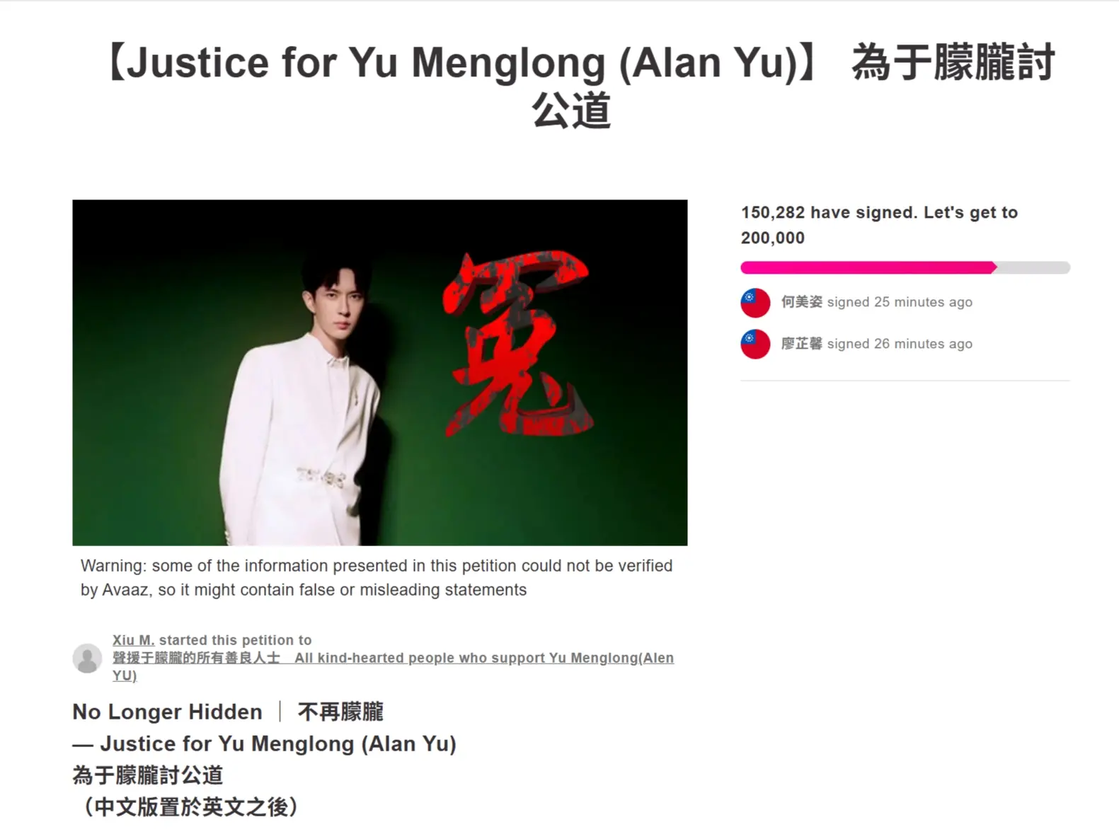 网友9月20日通过全球性非政府组织“AVAAZ”发起的“为于朦胧讨公道”全球连署,截至北京时间9月30日下午1点,已有15万人声援。(网页截图)