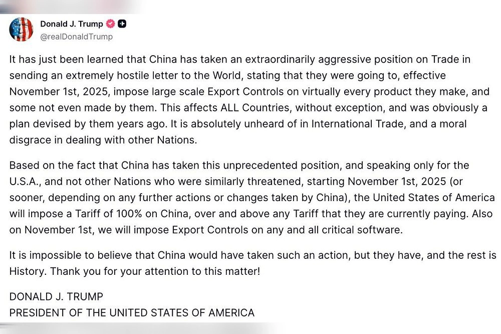 在亚太经济合作会议(APEC)即将于韩国举行之际,美国总统川普与中共国家主席习*近*平是否会在APEC上会面,受到全球的瞩目。然而,川普于本月10日在其社交媒体指出,中国在贸易问题上采取了非常激进强硬的立场,向世界发出了一封极具敌意的信(China has taken an extraordinarily aggressive position on Trade in sending an extremely hostile letter to the World)。为此,川普宣布自11月1日起,正式对中国的出口产品加征100%的关税。