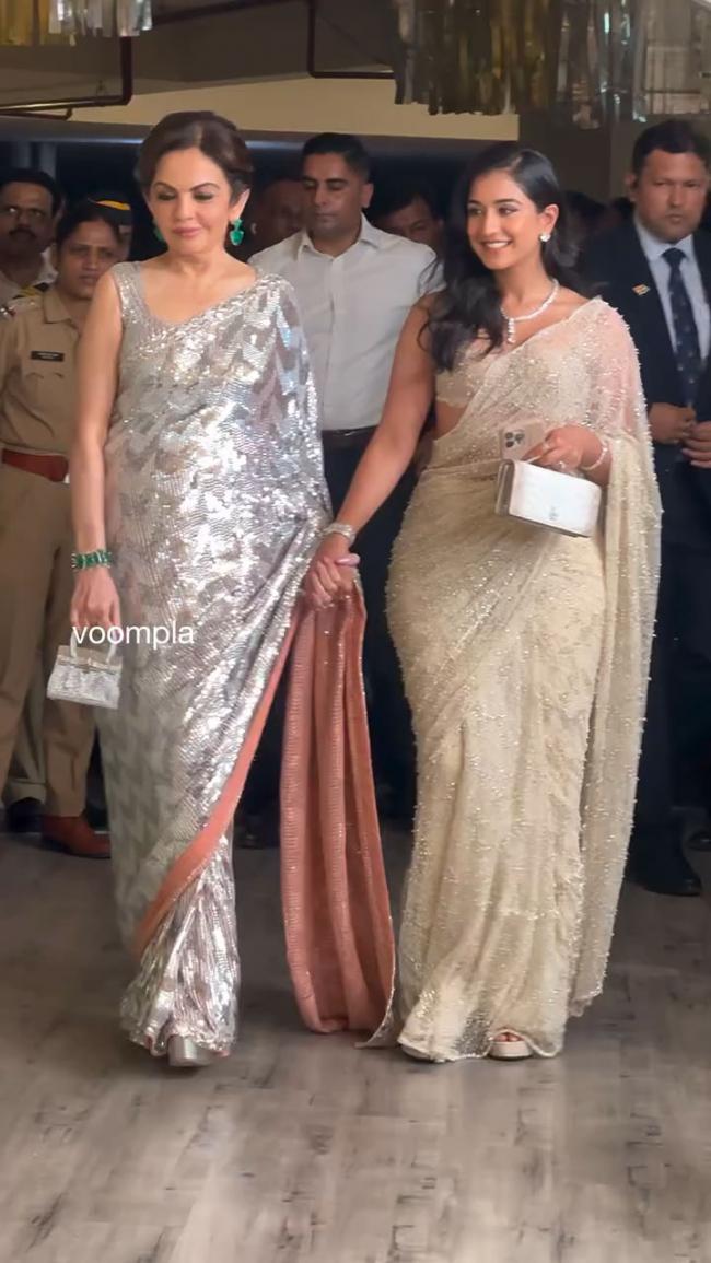 身为安巴尼家女主人的妮塔·安巴尼,也是经常穿着马洛特拉的作品亮相,这一次也不例外。银色亮片制成的纱丽在灯光的照耀下很是耀眼,为此妮塔还特意搭配了一只迷你版的爱马仕铂金包,据称那只包属于高级珠宝系列中的一款,颇为珍稀。