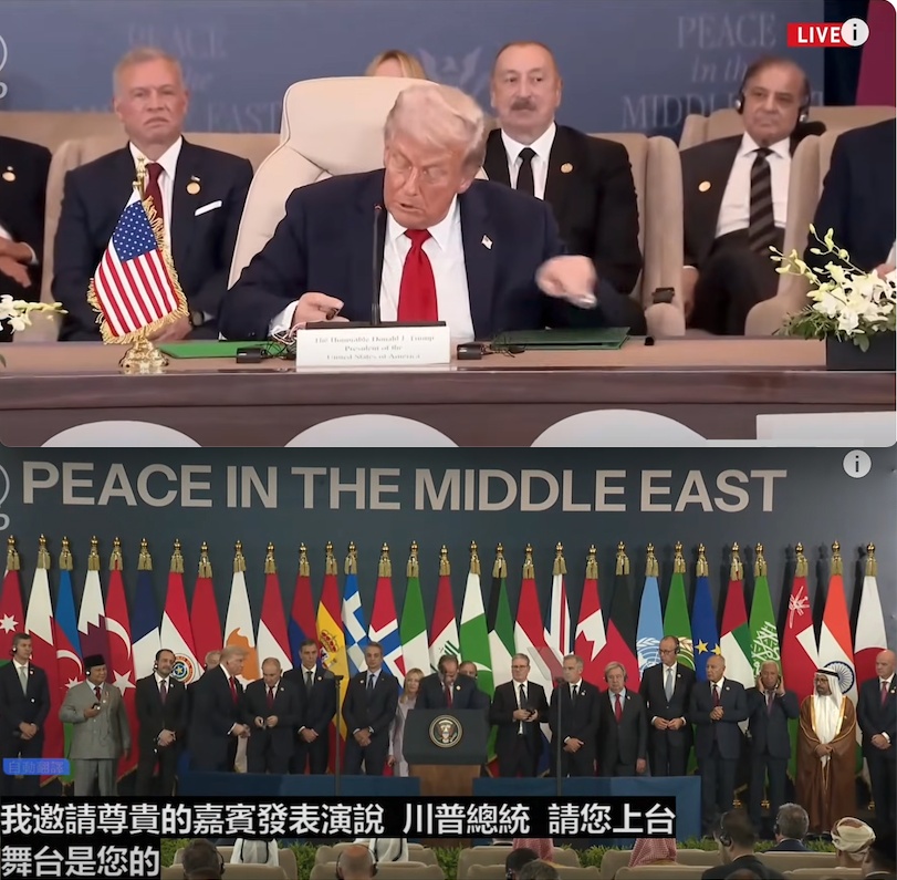 2025年10月13日,川普出席和平协议签署仪式并主持峰会。(视频截图)