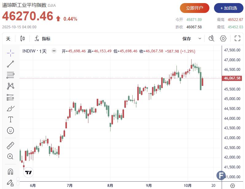 纳斯达克综合指数下跌0.8%,收于22,521.70点,盘中最大跌幅一度达2.1%。道琼斯工业平均指数则逆势小涨0.44%(+202.88点),收报46,270.46点,盘中一度上涨近1%,早盘则一度下跌1.3%。