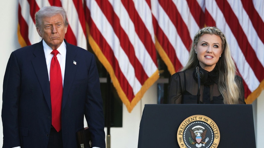 美国总统川普(左)于2025年10月14日在华盛顿特区白宫玫瑰园举行的追授查理·柯克总统自由勋章仪式上,已故保守派活动家查理·柯克的妻子埃里卡·柯克发表讲话。(Alex Wong/Getty Images)