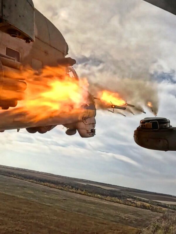 一架Mi-24“Hind”攻击直升机在乌克兰东部前线上空发射S-8火箭弹,对地面与低空目标进行攻击。图:翻摄自 X