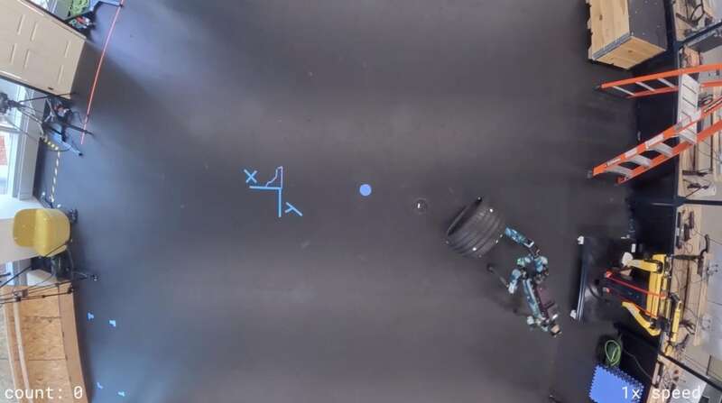 训练得到的轮胎滚动策略使机器人能够动态调整其躯干与Spot Arm的位置,以稳定控制滚动的轮胎,防止其倾倒,并将其引导至目标位置。