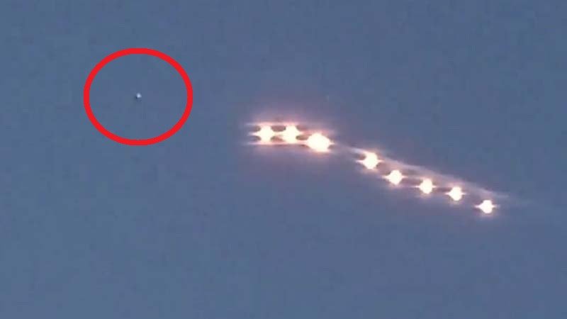 视频显示,夜空中疑似一个光点朝着斜上方飞行,每隔一段距离就爆出一串光球。光球沿着飞行路线排列,犹如串珠。每串光球持续时间不长,只悬浮几秒钟就消失不见。