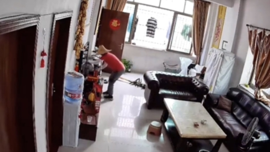 2025年10月15日,广东江门一户居民在家中睡觉,“灭蚊”人员未经允许进入家中,并擅自拿走多盆绿植。(网络视频截图)