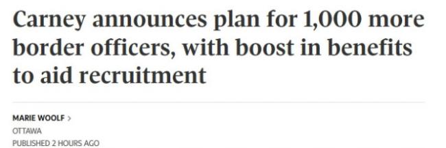 加拿大总理马克·卡尼(Mark Carney)今天宣布,政府计划新增聘用1000名边境安全官员,并将在即将公布的预算中提高其福利待遇,以吸引更多人才加入。