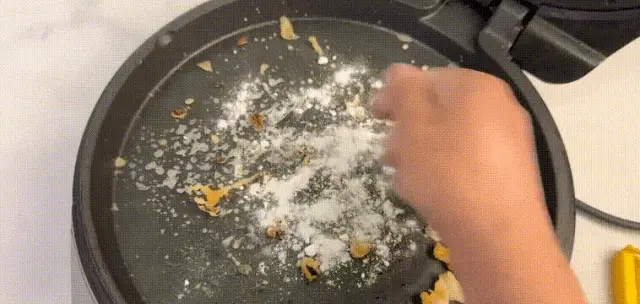污渍、油渍多的地方可以撒得多一点。撒之前,如果电饼铛里面还有大量油渍的话,可以先用纸巾简单擦一下,再撒上食用纯碱。