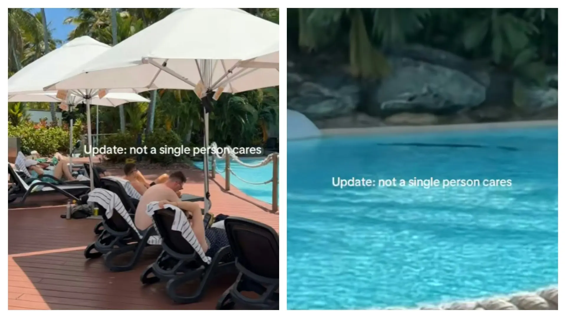 2025年10月18日,澳洲昆士兰,图为TikTok用户Lisa Keller上传影片截图的拼图,右图为一只鳄鱼潜入泳池底部;左图为顾客聚集在酒店泳池附近的度假躺椅上,泳池当时并未有游客进入,无人留意这只鳄鱼。(截图自TikTok@LISA KELLER)