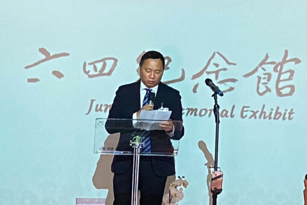 图为2025年6月2日,六四纪念馆从纽约迁至洛杉矶,馆长王丹在开馆仪式上发言。(马尚恩/大.纪.元;)