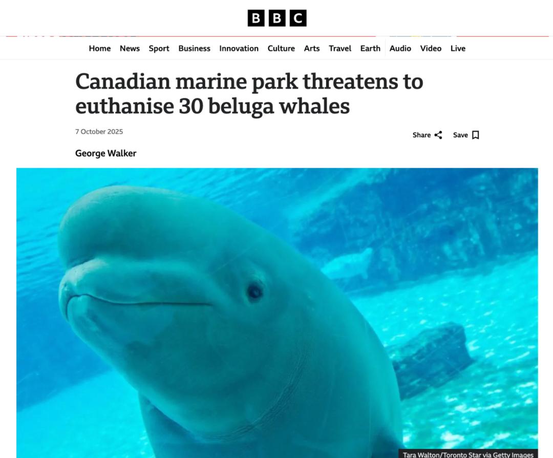 事实上,Marineland早已因动物福利问题备受争议。动物保护组织和媒体报道,自2019年以来,该园已有至少19头白鲸和1头虎鲸死亡。动物权利倡导者认为,这些死亡是圈养环境,长期造成生理与心理伤害的结果。另一方面,Marineland方面辩称,若无出口收入,他们将无法继续照顾这些动物,甚至暗示可能不得不在2025年10月7日对鲸鱼集体实施“安乐死”。