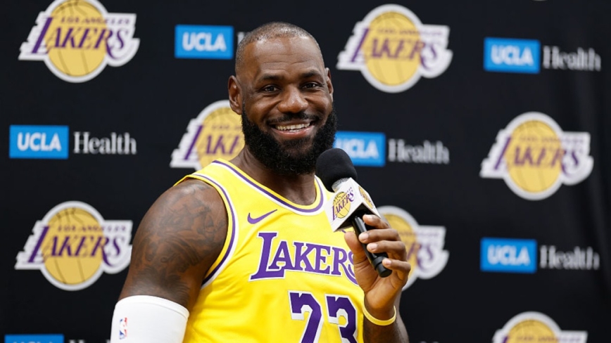 2025年9月29日,洛杉矶湖人队球员勒布朗詹姆斯在加州大学洛杉矶分校健康训练中心举行的洛杉矶湖人媒体日上接受媒体采访。(Ronald Martinez/Getty Images)