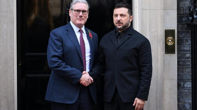 斯塔默与乌克兰总统泽连斯基在唐宁街10号前握手,2025年10月24日REUTERS- Jaimi Joy
