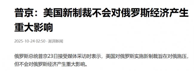 10月23日,俄罗斯总统普京接受媒体采访时表示,美国对俄罗斯实施新制裁旨在对俄施压,但不会对俄罗斯经济产生重大影响。