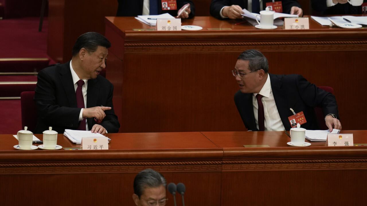 2024年3月5日星期二,北京人民大会堂,中共党魁习*近*平在全国人民代表大会(NPC)开幕式上向中国国务院总理李强做手势。 AP- Ng Han Guan