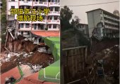 10月17日晚23时许,湖南邵阳市资江学校西边围墙和操场发生坍塌,导致教学楼西侧部分墙角受损。现场视频显示,操场地面裂开巨大深坑,紧邻的教学楼墙角混凝土剥落、钢筋外露,场面触目惊心。