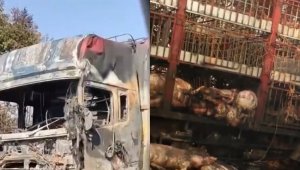 - 太惨了 湖北襄阳货车着火 近百头生猪被烤熟(图)