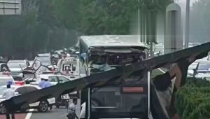 - 北京双层公交车撞上限高杆 遭“剃头”(图/视频)