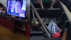 - 广东男家中淹水 淡定坐渔船看电视(图/视频)