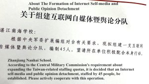 - 中共网军又征人了?南部战区组建“对台舆论分队”45人文件流传(图)